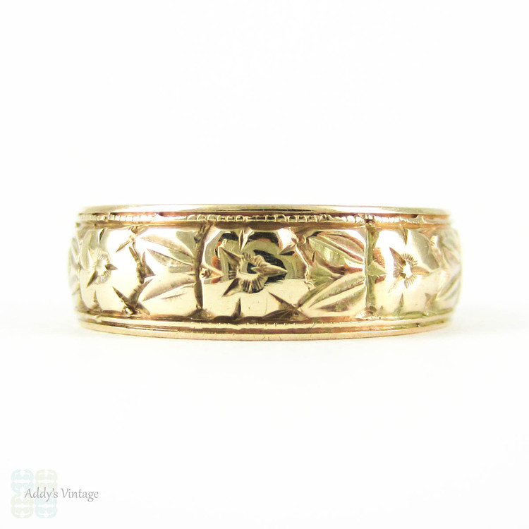 Antique wide orange blossom engraved wedding band. Dating to the early 20th century, this wide 9 carat gold wedding ring is engraved with a floral orange blossom design around it's exterior. The engraving is repeating, a single orange blossom flower with a pair of leaves. To either side is a small beaded edge next to a plain section. The plain edge sets of the design, highlighting it. This ring is wide, D shape in profile with a slightly rounded top and flat interior. Circa 1900 - 1910.
