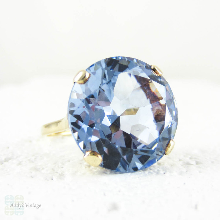 Large Blue Spinel Ring, Vintage Light Blue Synthetic Spinel Cocktail Ring in 9 Carat Yellow Gold, Circa 1970s.