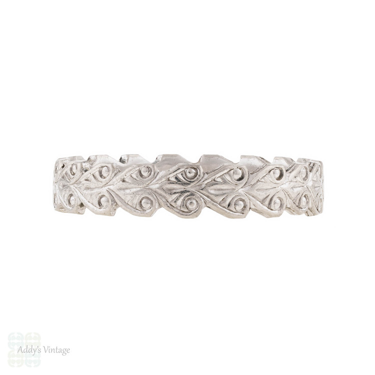 Lovely engraved platinum wedding ring. Links of platinum, shaped like leaves or hearts, interlock and encircle the finger. The metal dips between each leaf giving the ring a ruffled edge. Each leaf or heart shape is hand engraved with a little scroll pattern. This ring is of a medium width, great to wear either alone or paired with others. Circa mid 1930s - 1940s, British.